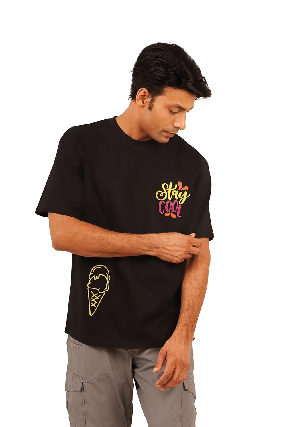 + Free ShippingSun Vibe Stay Cool Oversized Black T-Shirt |240 GSM Cotton | Drop Shoulder | Bold Summer Graphic Tee | Breathable Bio-Washed Jersey for Sunny Days for Men & Women
